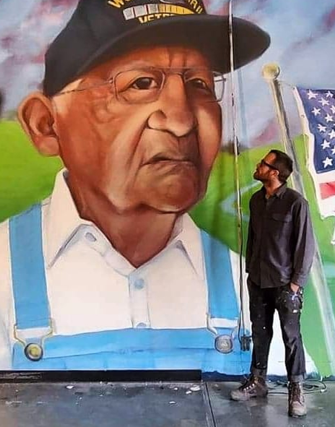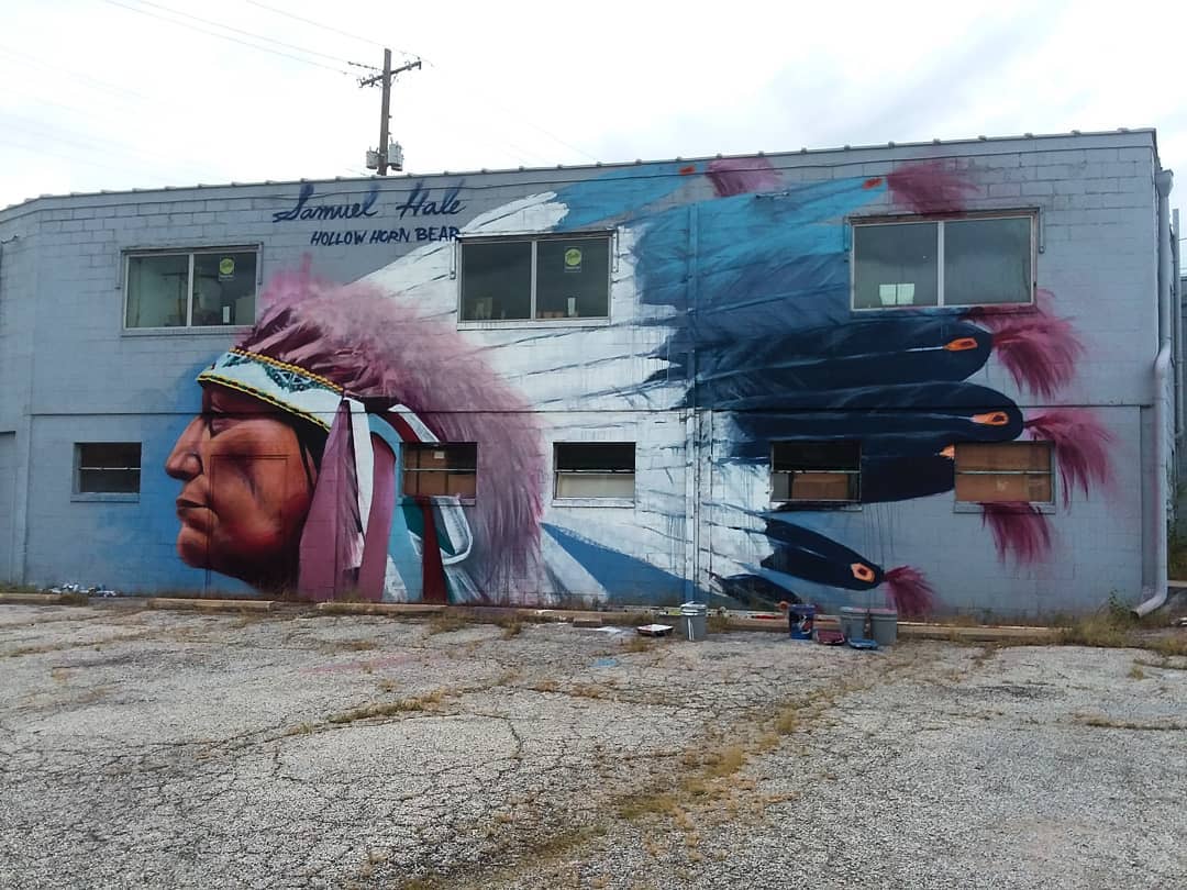 A local artist born and raised in the northwest Arkansas hills, Samuel’s murals focus on portraits and figures of America folklore and history that attempt to capture raw emotion with dramatic perspective.