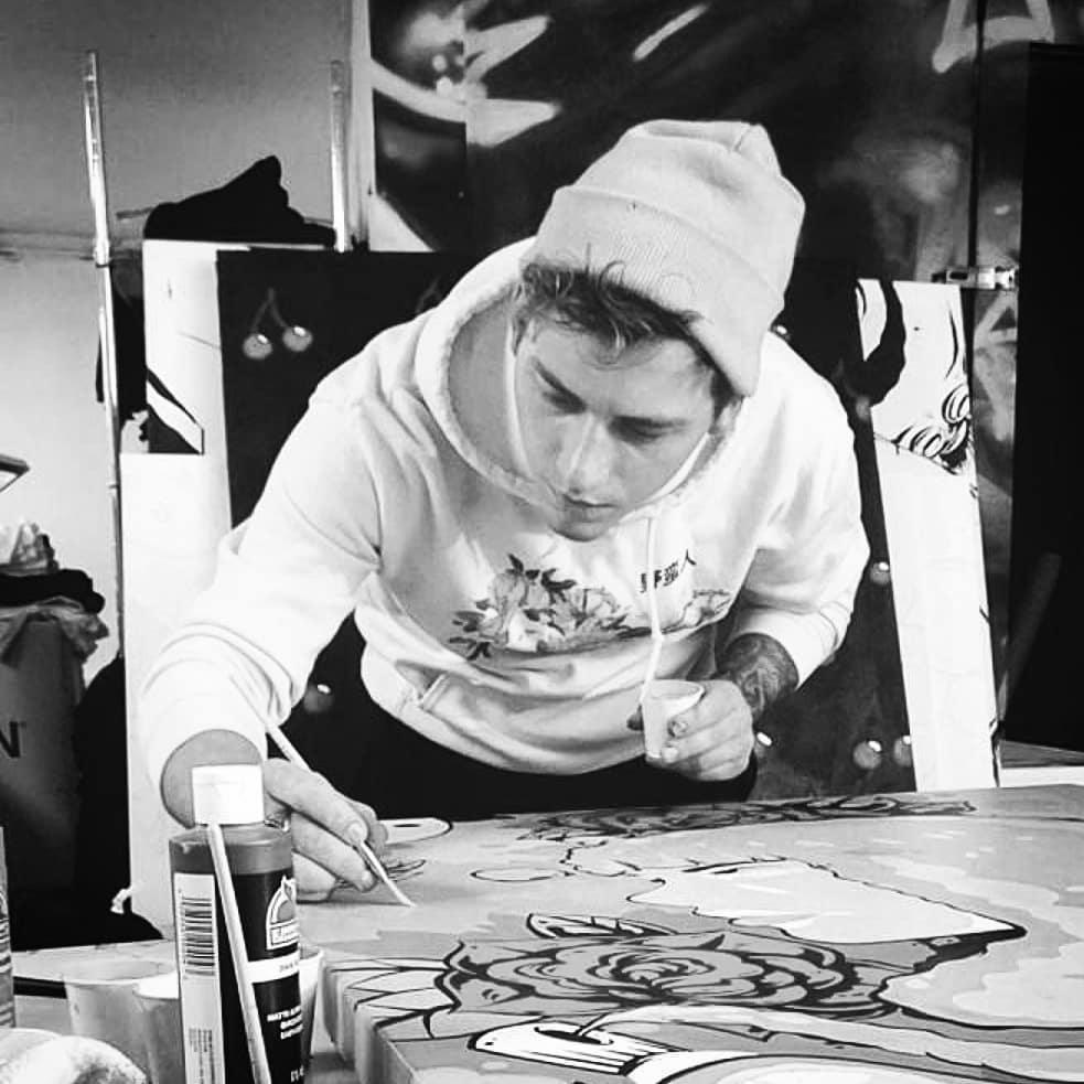In high school he competed in two art competitions, didn’t win anything, and got away from drawing and into commercial art. This lead to him making his own clothing company called ”Adolescent Riche$$”. Through this he won an advertisement competition by Sole Magazine for an article and recognition. He recently got his degree in the sneaker essentials program from University of New York FIT (Fashion Institute of Technology). Marcus has never painted a mural but will be collaborating with Tiger Sasha and learning on the go. He specializes in digital editing, pen and ink, alcohol based markers, and colored pencils. His artwork is spreading across NWA through commissions and shoe refurbishment/customs. He is currently living in Fayetteville with his girlfriend and two puppies.