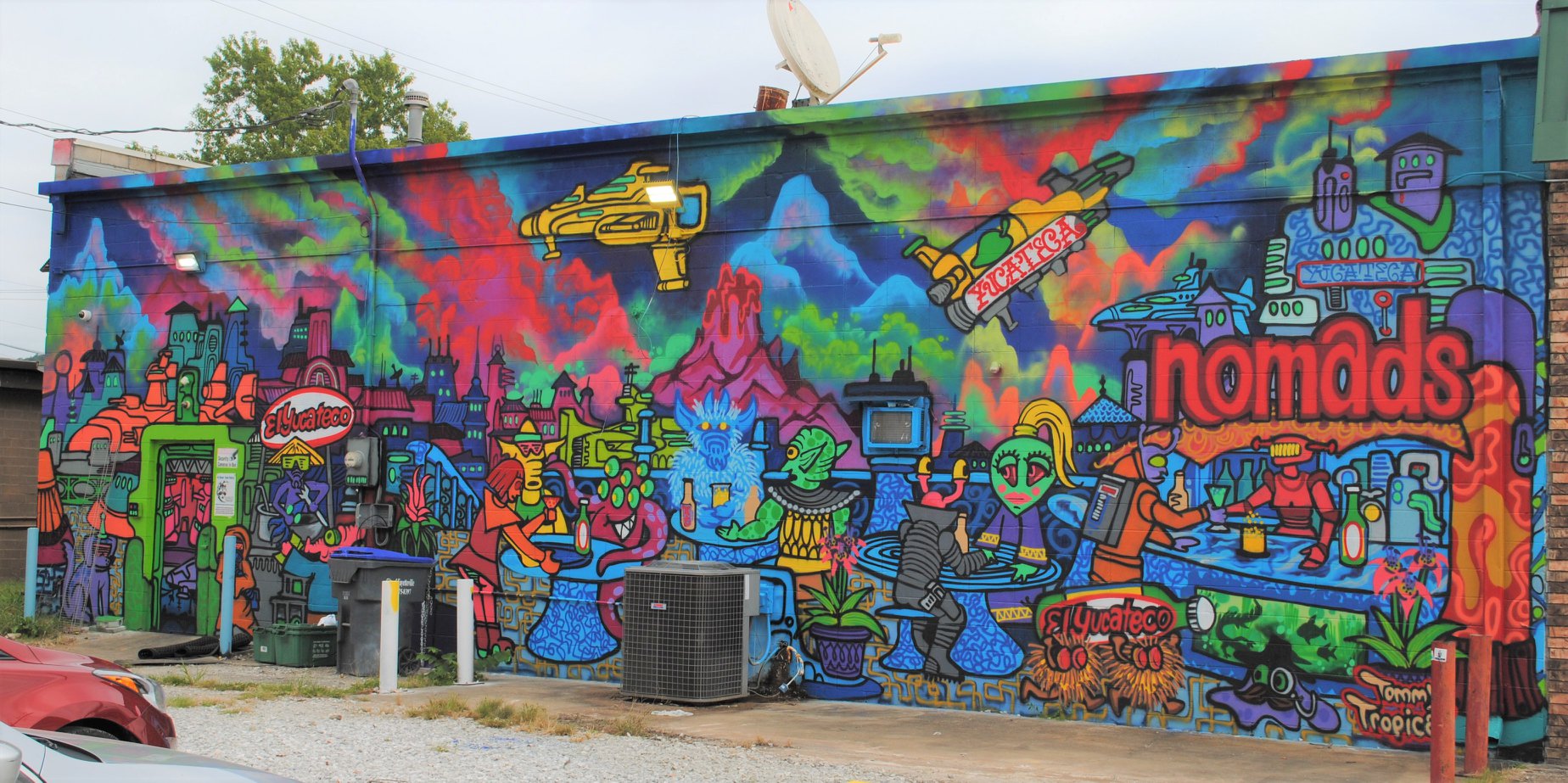 Tommy Tropical is an Arkansas based muralist, sign painter, and worldbuilder. He describes his style as “psy-fi,” influenced by science fiction, psychedelic art, comics, video games and surrealism. Using spray paint, markers, and acrylic paint, his brightly-colored designs feature imaginary landscapes, elaborate lettering, and comic relief. He has rambled the country painting and showing his works, and he cruises the known universe for inspiration.